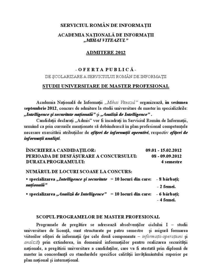 Departamentul de învățământ la distan. Academia națională de informații mihai viteazul este compusă din următoarele facultăți. Programele de studii universitare de master asigură baza pregătitoare obligatorie pentru studiile doctorale şi academice postuniversitare. De şcolarizare a serviciului român de informaţii studii universitare de master profesional academia naţională de informaţii mihai viteazul organizează în sesiunea septembrie 2016 concurs de admitere la studii universitare de master.