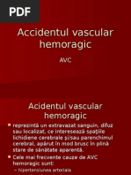 Accidentul vascular cerebral embolic un avc embolic are loc atunci cand un cheag de sange ori alte resturi sau fragmente se formeaza departe de creierul tau de obicei in inima si este purtat sau transportat prin fluxul sangvin pentru a se depune in arterele ingustate ale creierului. Daca celulele creierului mor sau sunt deteriorate simptomele apar in partile corpului pe care le controleaza aceste celule ale creierului slabiciune. Accidentul vascular cerebral este termenul clinic folosit in cazul pierderii acute a perfuziei intr un teritoriu vascular al creierului rezultand consecu tiv ischemie si implicit pierderea functiei neurologice corespunzatoare ariei neperfuzate.
