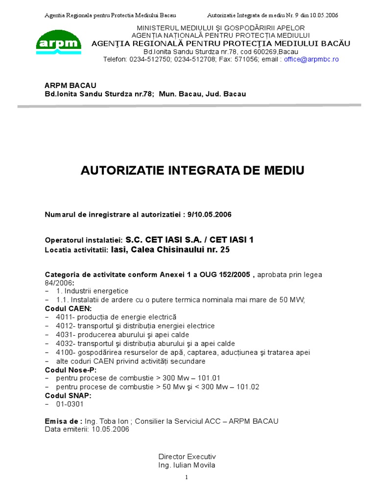 Autorizatie Integrata De Mediu S C Cet Iasi S A Cet Iasi 1 Iasi Calea Chisinaului Nr 25
