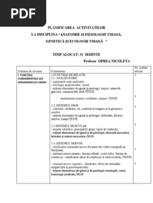 Planificarea Activitatilor La Disciplina Anatomie Si Fiziologie Umană Genetică Si Ecologie Umană