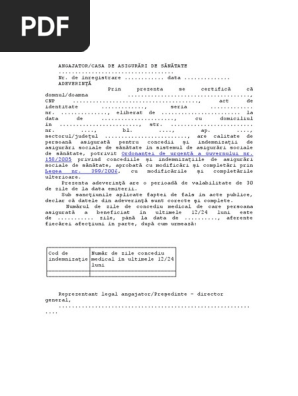 Fișiere atașate anexa 1 centralizator privind certificatele de concediu medical doc anexa 10 cererea tip solicitare cuantum din fnuass doc decontarea certificatelor medicale pentru carantina 1 docx documente necesare pentru dosarul de recuperare concedii medicale doc anexa 7 adeverinta numar zile de concediu medical model 2020 docx mod completare cm de catre angajator doc. 1546 938 2020 privind modificarea anexelor nr. Adeverință din care reiese numărul de zile de concediu medical avute. Noul formular al adeverinţei de salariat pentru concediu medical a fost publicat în anexa ordinului comun al ministerului sănătăţii şi cnas nr.