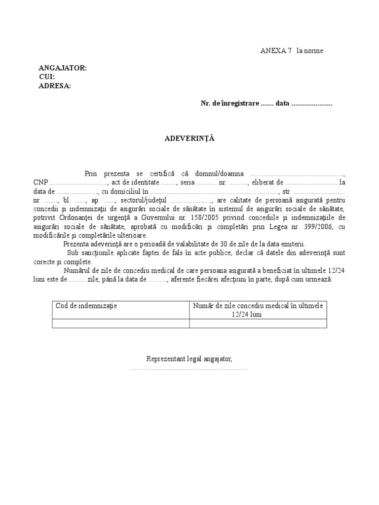 Anexa 7 concediu medical. Fișiere atașate anexa 1 centralizator privind certificatele de concediu medical doc anexa 10 cererea tip solicitare cuantum din fnuass doc decontarea certificatelor medicale pentru carantina 1 docx documente necesare pentru dosarul de recuperare concedii medicale doc anexa 7 adeverinta numar zile de concediu medical model 2020 docx mod completare cm de catre angajator doc. Acasă etichete anexa 7 adeverinta concedii medicale nou cnas model doc. Adeverinta se elibereaza numai persoanelor asigurate care indeplinesc conditia de stagiu de asigurare prevazuta la art. Noul formular al adeverinţei de salariat pentru concediu medical a fost publicat în anexa ordinului comun al ministerului sănătăţii şi cnas nr.