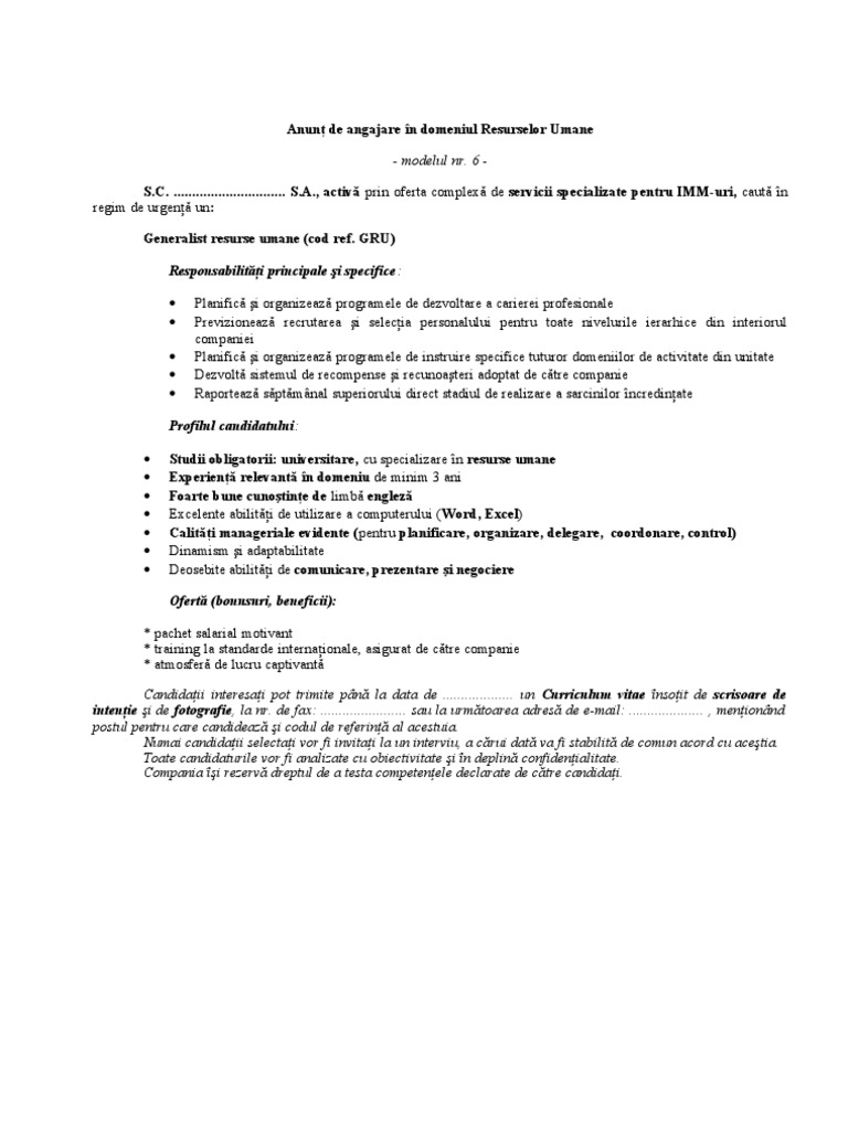 Impactul unui anunt de recrutare pentru un candidat valoros este asemanator cu impactul pe care il are un cv pentru o companie. Model de ro sau catalogul modelelor este site ul unde vei gasi o multitudine de informatii utile. Formare profesională cazare gratuită lucrul într o echipă unde ai ocazia să înveți bonusuri. Cauti un model de anunt.