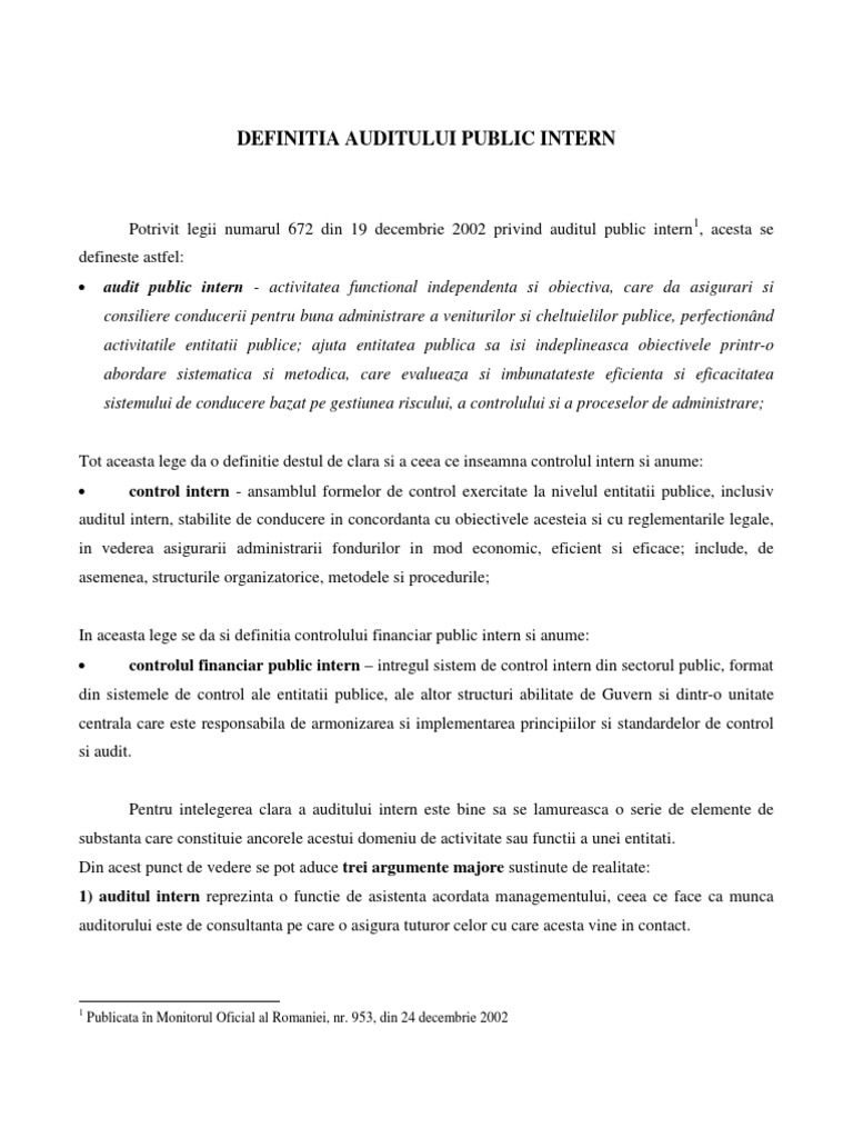 672 19 decembrie 2002 privind auditul public intern activitatea de audit intern din cadrul instituţiilor publice trebuia abordată într un mod fundamental diferit de cel în care se desfăşurase până la acea dată. Sunt obligate sa isi formeze compartimente proprii pentru auditul public intern toate institutiile publice cu exceptia. 856 din 5 decembrie 2011 republicata in temeiul art. Normele privind înfiinţarea comitetelor de audit intern in institutiile publice au fost publicate in monitorul oficial nr.