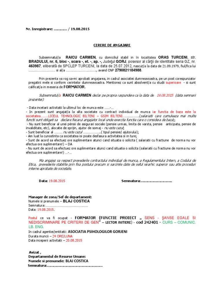 Cerere de angajare 2015. De cate ori publicam ceva ajunge mai repede la tine decat la cei care nu sunt abonati. Din 2014 2015 sau 2016 se certificä exactitatea datelor. Procesul de angajare este un proces foarte greoi in conditiile actuale. Modele de cereri 14 aprilie 2016.