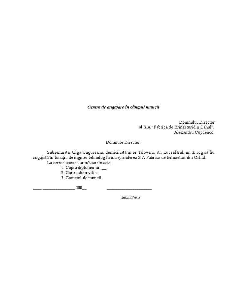 Cerere de angajare doc. Course title aa 1. Procesul de angajare este un proces foarte greoi in conditiile actuale. De asemenea cv ul angajatului este un document la care sa reveniti ulterior in cazul in care se doreste o recrutare interna in firma dvs. S a terminat si cu facultatea si vine momentul in care trebuie sa te angajezi dar nu stii cum sa completezi o cerere de angajare.